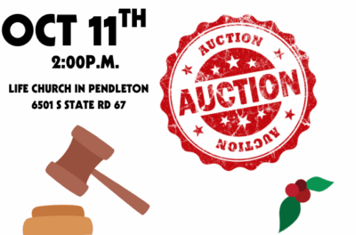 Saturday, October 11th 2pm Our first outdoor LIVE auction! We are accepting working items and decor from the community. Please contact Angie Simon 765-623-6487 for information. And thank YOU for